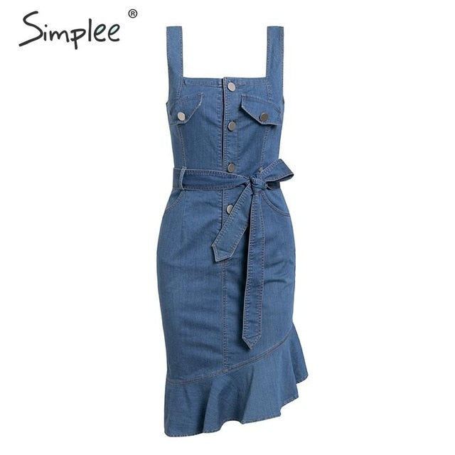 Simplee Casual blue women summer denim dress Elegant ruffle mermaid sash buttons jeans dresses Streetwear bodycon vestidos 2019