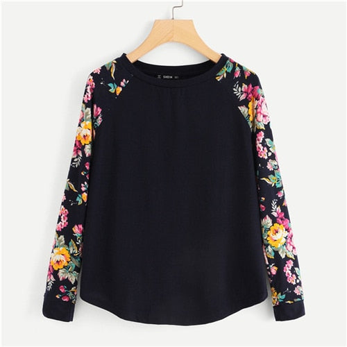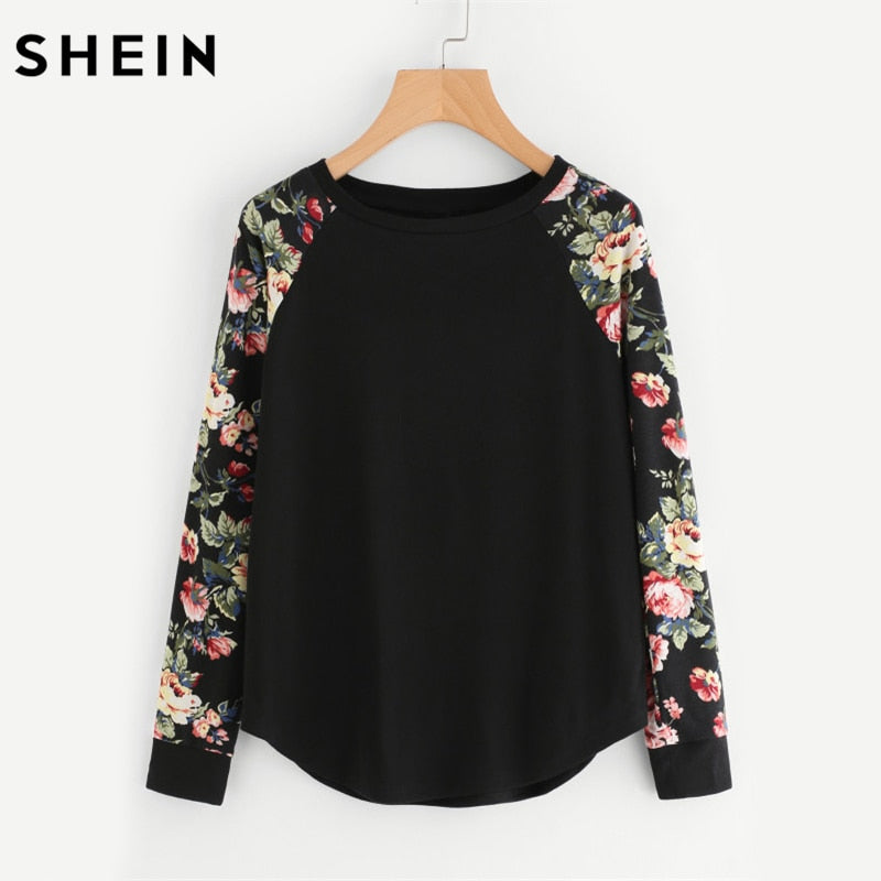 SHEIN Floral Raglan Sleeve Curved Hem Womens Tee Shirts Autumn Womens T shirts Casual Ladies Black Long Sleeve T shirt