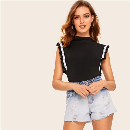 SHEIN Mock Neck Striped Pleated Ruffle Armhole Top Women Stand Collar Sleeveless T-shirt Ladies Spring Stretchy Tees